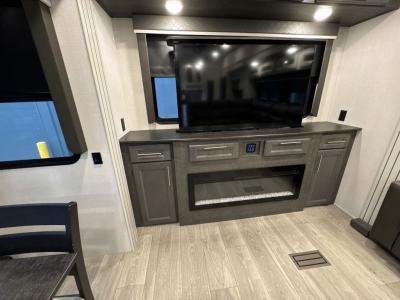 Time at the campground will be spent in comfort thanks to this fifth wheel that can sleep four to six people comfortably. The rear living area/den includes a huge L-shaped sofa with theater seats and a king tri-fold sofa, plus a free-standing dinette with an ottoman on one side, a fireplace, and an LED HDTV for movie nights. The chef of your group will love the additional counter space in the kitchen, along with a 21" Furrion range, plus a pantry and 16 cu. ft. 12V refrigerator. The full bath allows you to clean up each day and the front private bedroom will provide you with your own space at night. Here, you'll find a queen bed slide out that can optioned out for a king bed, plus a full height wardrobe, a second wardrobe with washer and dryer prep, and a dresser with a sliding top and hidden storage for valuables!