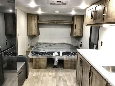 Camping trips just got easier travel trailer that can sleep three to four each night! You'll enjoy more floor space to move about thanks to the sofa slide out, and the full bath is tucked in the back for added privacy. There is generous counter space in the kitchen, along with a two-burner cooktop and microwave oven to cook meals. Up front, you'll find a picnic table to dine at, plus a Murphy style pull-out Olympic RV queen-size bed, giving you both seating and sleeping space. Dual bedside wardrobes will let you keep your clothes organized, and an exterior pass-through storage will be perfect for fishing poles, camp chairs and more!