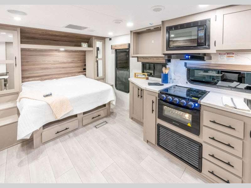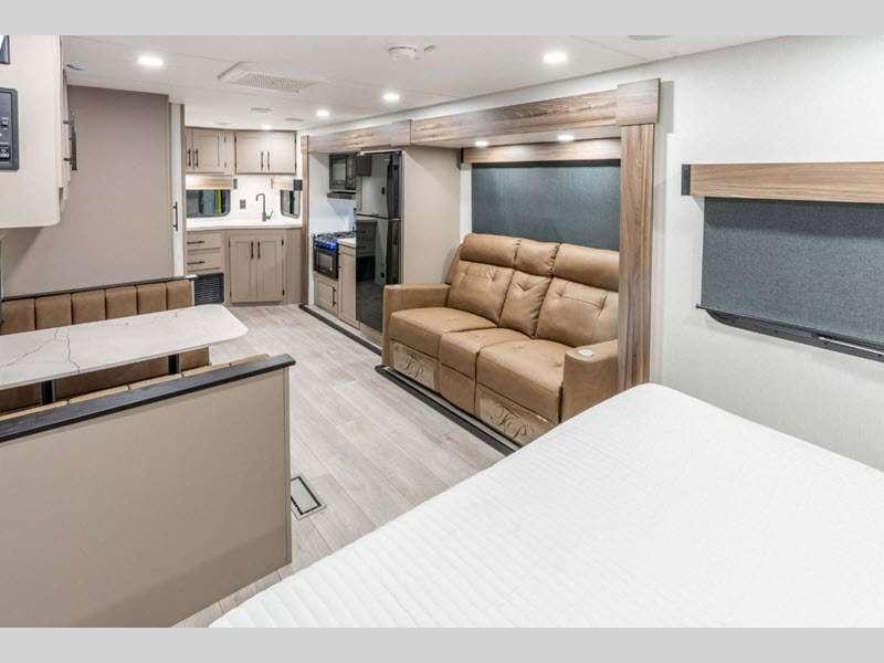 Sleeps 2 Slides 2 Length 31 ft 11 in Ext Width 8 ft Ext Height 10 ft 10 in Int Height 6 ft 6 in Interior Color Chocolate Hitch Weight 700 lbs GVWR 8800 lbs Dry Weight 6570 lbs Cargo Capacity 2230 lbs Fresh Water Capacity 45 gals Grey Water Capacity 62 gals Black Water Capacity 32 gals Tire Size 15" Furnace BTU 30000 btu Available Beds Queen Refrigerator Type 12V Refrigerator Size 10 cu ft Cooktop Burners 3 Number of Awnings 1 Axle Weight 5870 lbs LP Tank Capacity 30 lbs Water Heater Type On demand tankless AC BTU 13500 btu Awning Info 19' Power w/LED Lighting Axle Count 2 Number of LP Tanks 1 Shower Type Standard Electrical Service 30 amp Similar Floorplans