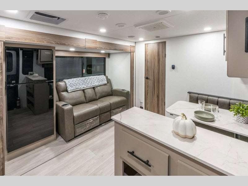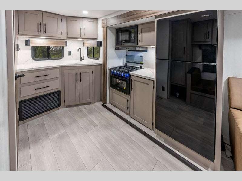 Sleeps 8 Slides 1 Length 29 ft 1 in Ext Width 8 ft Ext Height 10 ft 10 in Int Height 6 ft 6 in Interior Color Chocolate, Mink Hitch Weight 710 lbs GVWR 7000 lbs Dry Weight 5600 lbs Cargo Capacity 1400 lbs Fresh Water Capacity 45 gals Grey Water Capacity 32 gals Black Water Capacity 32 gals Tire Size 15" Furnace BTU 30000 btu Number Of Bunks 2 Available Beds Queen Refrigerator Type 12V Refrigerator Size 10 cu ft Cooktop Burners 3 Shower Size 30" x 36" Number of Awnings 1 Axle Weight 4890 lbs LP Tank Capacity 20 lbs Water Heater Type Tankless AC BTU 13500 btu Awning Info 18' Power w/LED Light Strip Axle Count 2 Number of LP Tanks 2 Shower Type Standard Electrical Service 30 amp Similar Floorplans