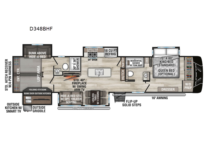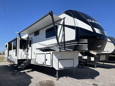 Sleeps 9 Slides 5 Length 42 ft 2 in Ext Width 8 ft Ext Height 12 ft 11 in Interior Color Mink, Pebble Hitch Weight 2580 lbs GVWR 15995 lbs Dry Weight 13830 lbs Cargo Capacity 2165 lbs Fresh Water Capacity 76 gals Grey Water Capacity 100 gals Black Water Capacity 50 gals Tire Size 16" Furnace BTU 35000 btu Number Of Bunks 3 Available Beds King Refrigerator Type Residential Refrigerator Size 18 cu ft Convection Cooking Yes Cooktop Burners 4 Shower Size 30" x 36" Number of Awnings 1 Axle Weight 11250 lbs LP Tank Capacity 30 lbs Water Heater Type On Demand Tankless AC BTU 15000 btu TV Info LR 43" Smart LED TV, Ext. Smart TV Awning Info 16' Power w/LED Light Strip Axle Count 2 Washer/Dryer Available Yes Number of LP Tanks 2 Shower Type Shower w/Seat Electrical Service 50 amp Similar Fifth Wheel Floorplans