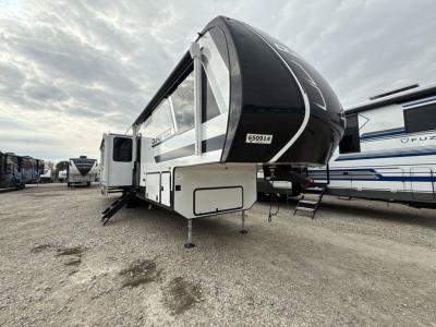All of your friends and family can camp together in this fifth wheel! It features a rear private bunkhouse with a bunk above a hide-a-bed sofa, a full bathroom with a 30" x 36" shower, and an entertainment center with wardrobes on either side. There is also a folding bunk and a bunk over the outside kitchen. Across from the hide-a-bed sofa is an entertainment center with a 40" fireplace and a 43" smart TV to watch your favorite movies at night. The kitchen island will allow you to cook with ease and you can prepare your best meals with the four burner range with a 24" oven. The second bathroom has a residential shower with a seat and a linen closet to keep your towel close. Enjoy a good night's rest on the king bed slide in the front private bedroom which also has a dresser and a front wardrobe with washer and dryer prep!