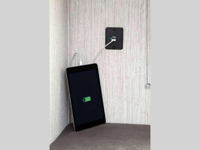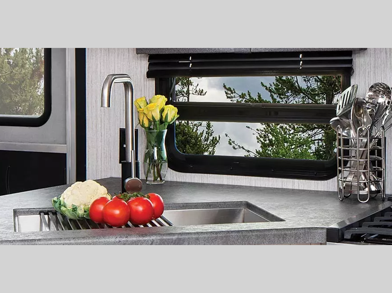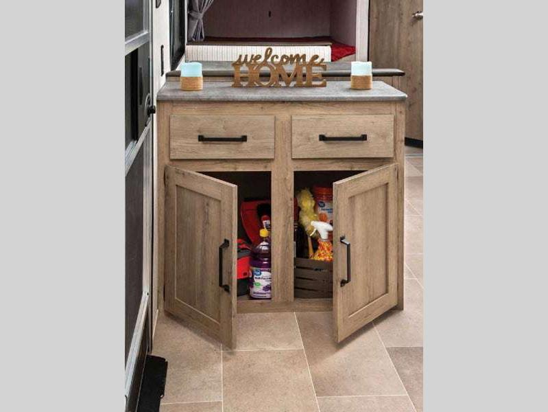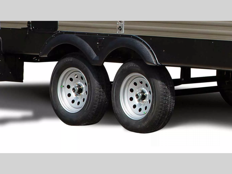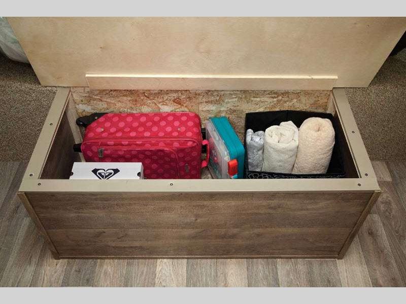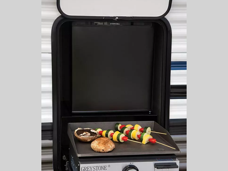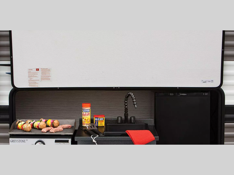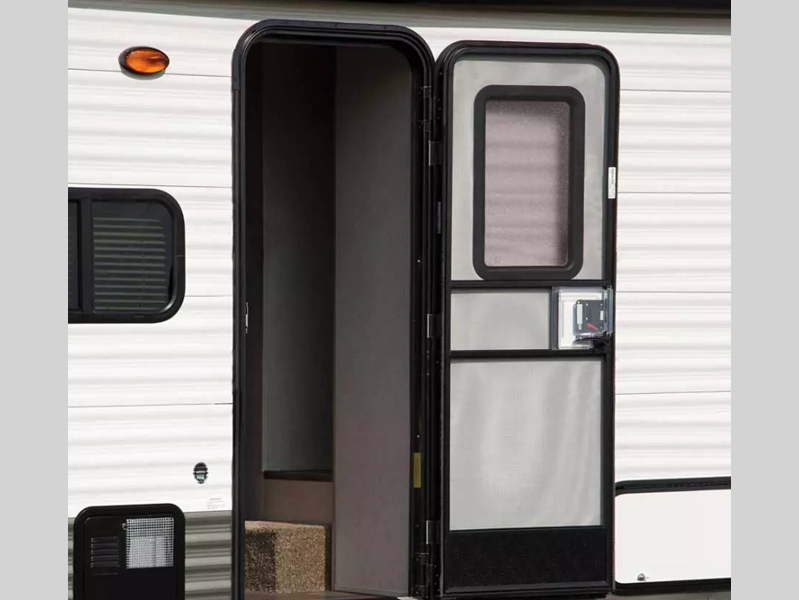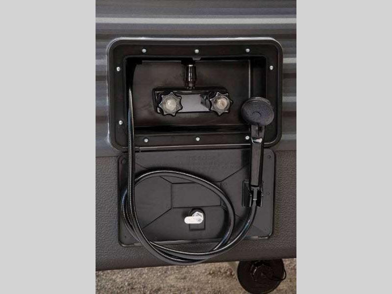 There is a front diamond late for added protection against rock and debris on the way to the campground, and you'll appreciate the aluminum solid double step for added stability when entering your trailer. A power tongue jack, outside shower, and exterior speakers are just a few additional exterior features you are sure to love. Inside, you'll find Congoleum linoleum, night roller shades, tinted windows, and many more comforts.