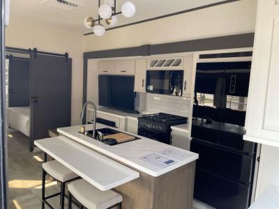 This fifth wheel offers a highly versatile layout designed to adapt to your lifestyle. The front bedroom is a flexible space featuring a sofa on a slide-out and a desk that easily converts into a Murphy bed, making it ideal as a remote office, an extra-sleeping area for guests, or even a cozy living space with a smart TV. A full bathroom is conveniently located nearby for added comfort. In the center of the trailer, you'll find a spacious living area with a five-piece sectional recliner and an expandable dinette to accommodate everyone. The well-equipped kitchen includes essentials like a four-burner range and a French door refrigerator, perfect for cooking up your favorite meals. At the rear, the master bedroom offers a relaxing retreat with a king-sized bed and direct access to a full bathroom featuring a dual vanity, bringing the comforts of home wherever you go.