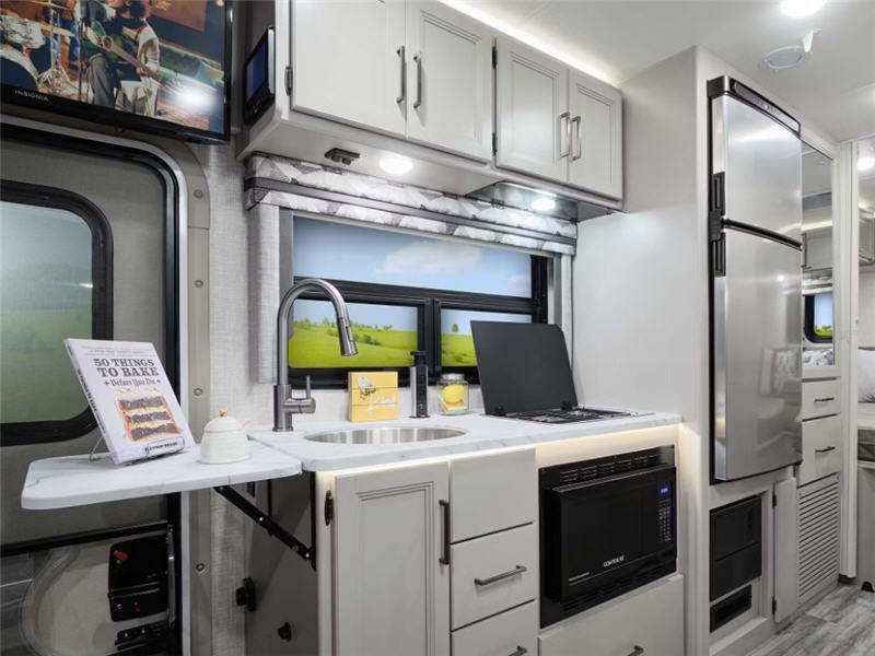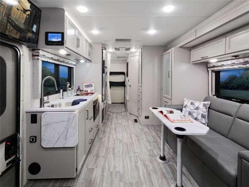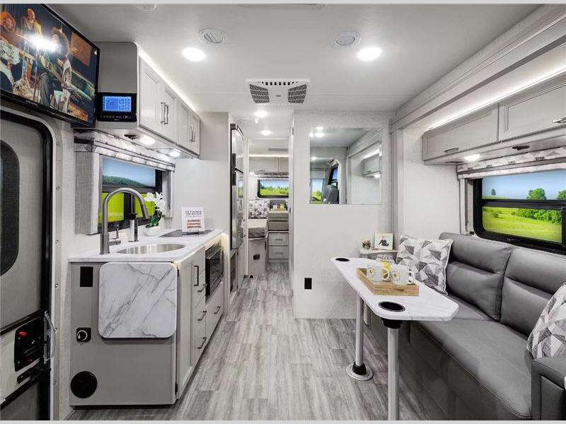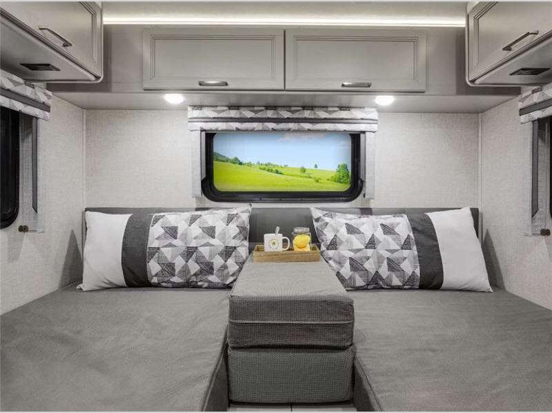 The Ford E-Series chassis will provide a strong foundation to your RV and the 14" touchscreen dash radio will make each drive hassle-free. Each model is constructed with a welded tubular steel floor, a premium one-piece fiberglass front cap, and Vacu-bond laminated roof, walls, and floors with block foam insulation. The versatile interior includes different furniture configurations to best fit your needs, complete kitchen and bath accommodations, and residential vinyl flooring to bring a touch of home wherever you roam.